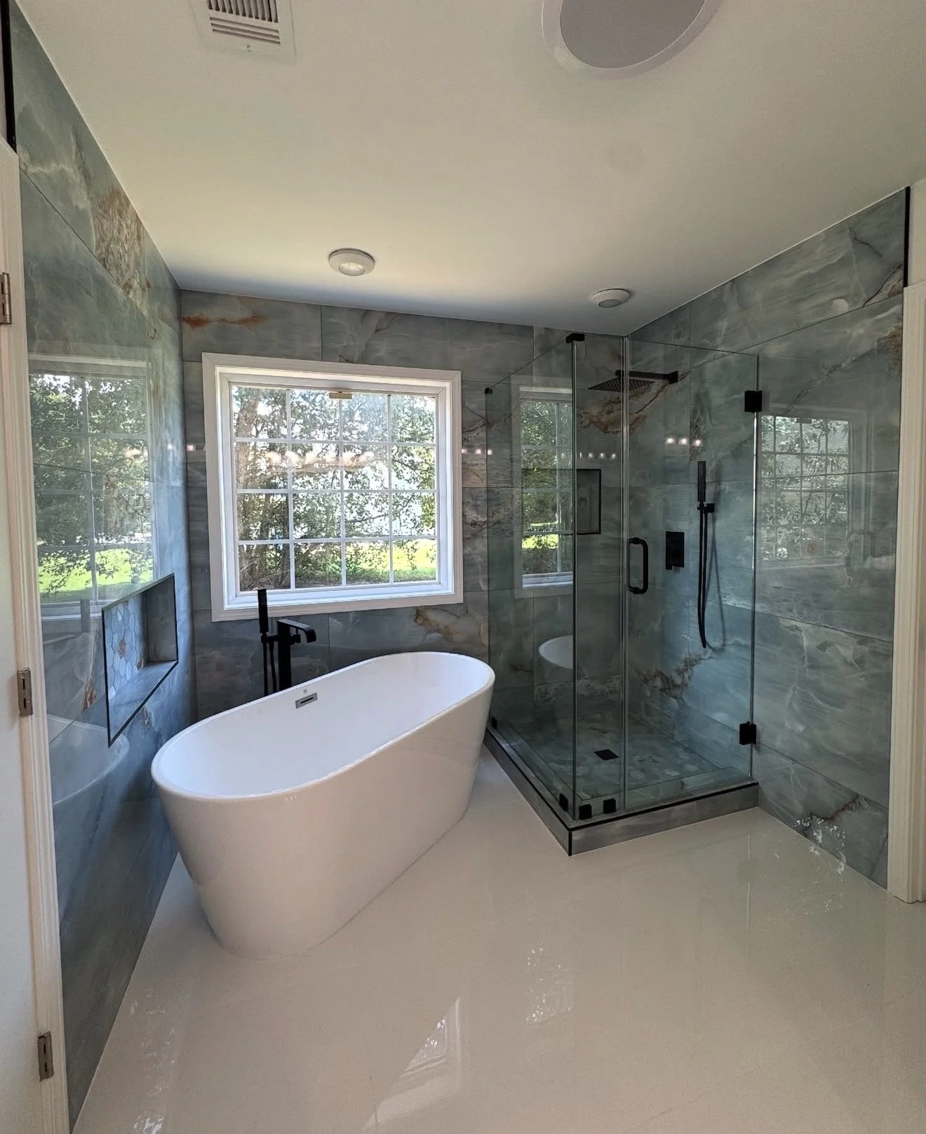 Our bathroom renovations include full or partial upgrades such as tile work, showers, tubs, vanities, lighting, plumbing updates, and modern design improvements for a clean, functional finish.